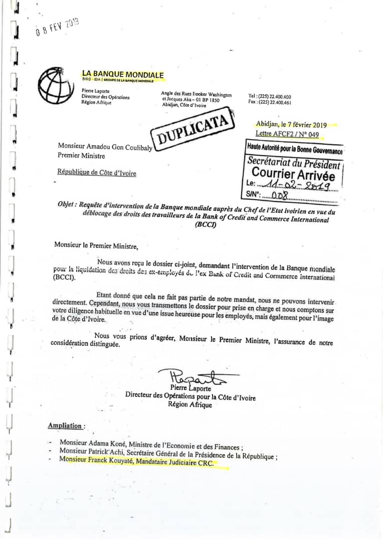 Préoccupé par la situation de précarité des ex-travailleurs de la BCCI, le mandataire judiciaire avait sollicité la banque mondiale qui lui répondit le 07 février 2019. En effet, dans une requête d’intervention auprès du chef de l’Etat Ivoirien en vue du déblocage des droits des travailleurs de la banque de crédit et de commerce international (BCCI), le patron de la banque mondiale s’était fait l’avocat de Franck Kouyaté. « Nous vous transmettons le dossier pour prise en charge et nous comptons sur votre diligence habituelle en vue d’une issue heureuse pour les employés, mais également pour l’image de la Côte d’Ivoire », dixit Pierre Laporte directeur des opérations pour la Côte d’Ivoire région Afrique.