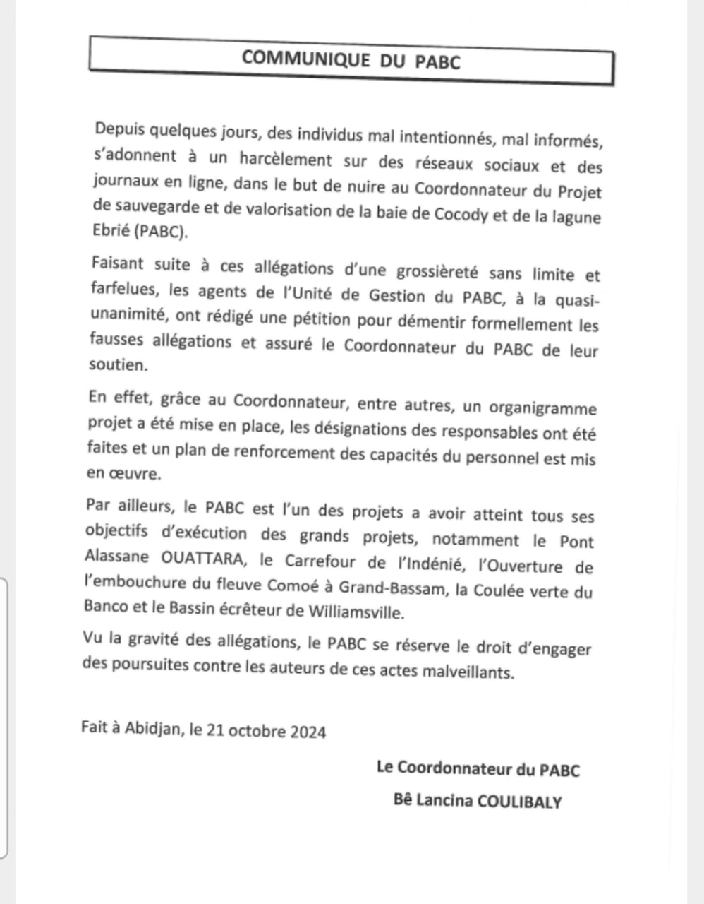 Il produit un communiqué qui découle d’une pétition sans jamais publier ladite pétition. Le communiqué devait être accompagné de la pétition. Sans pétition, ce communiqué n’aura aucun sens. Et puis, M. Bê Lancina Coulibaly, pour son honorabilité, aurait dû cacheter et signer son communiqué. Mais, à première vue, cela ressemble bien à un tract et porte un discrédit sur le sérieux de ce communiqué s’il est bien de lui. A la vérité, le coordonnateur tente à travers ce communiqué de cacher le soleil de la main. Au PABC, le mal est vraiment profond.