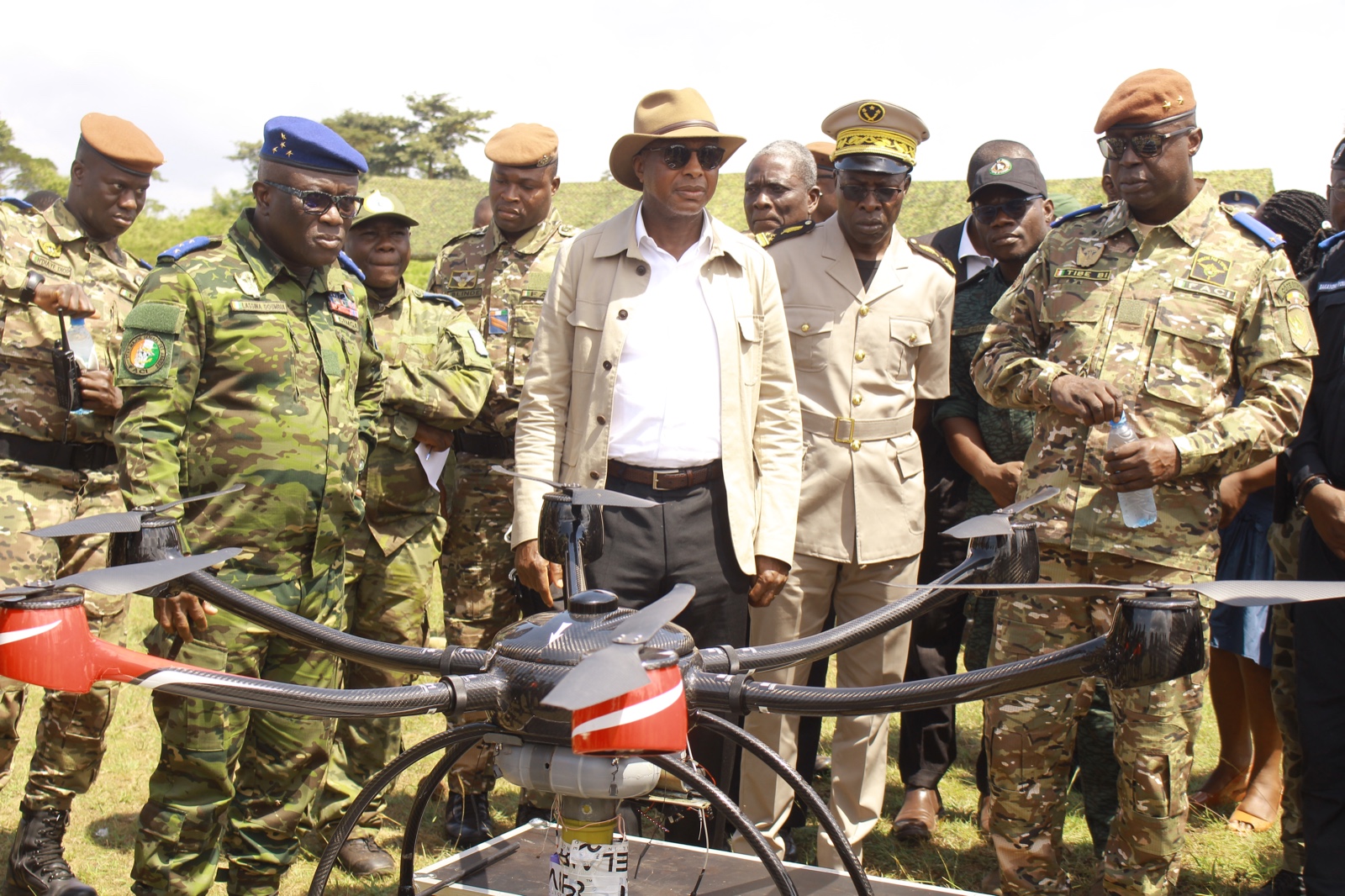 Photo légendée : Le Général de Corps d’armée Lancina Doumbia inspectant un drone lors de l’exercice.