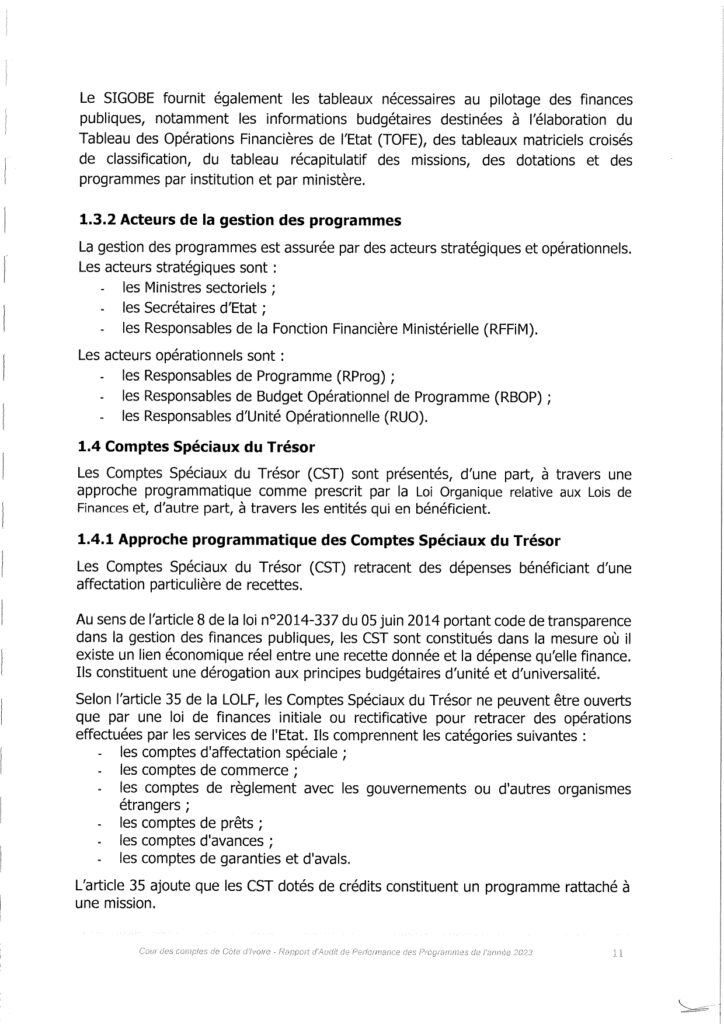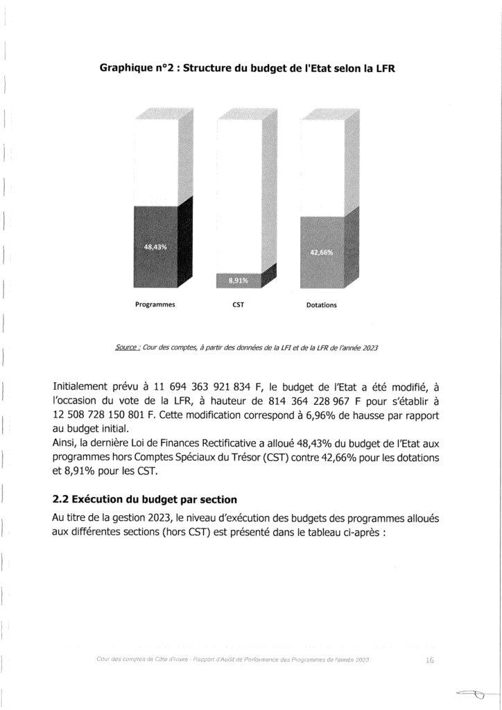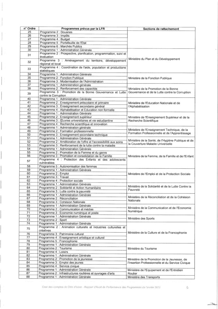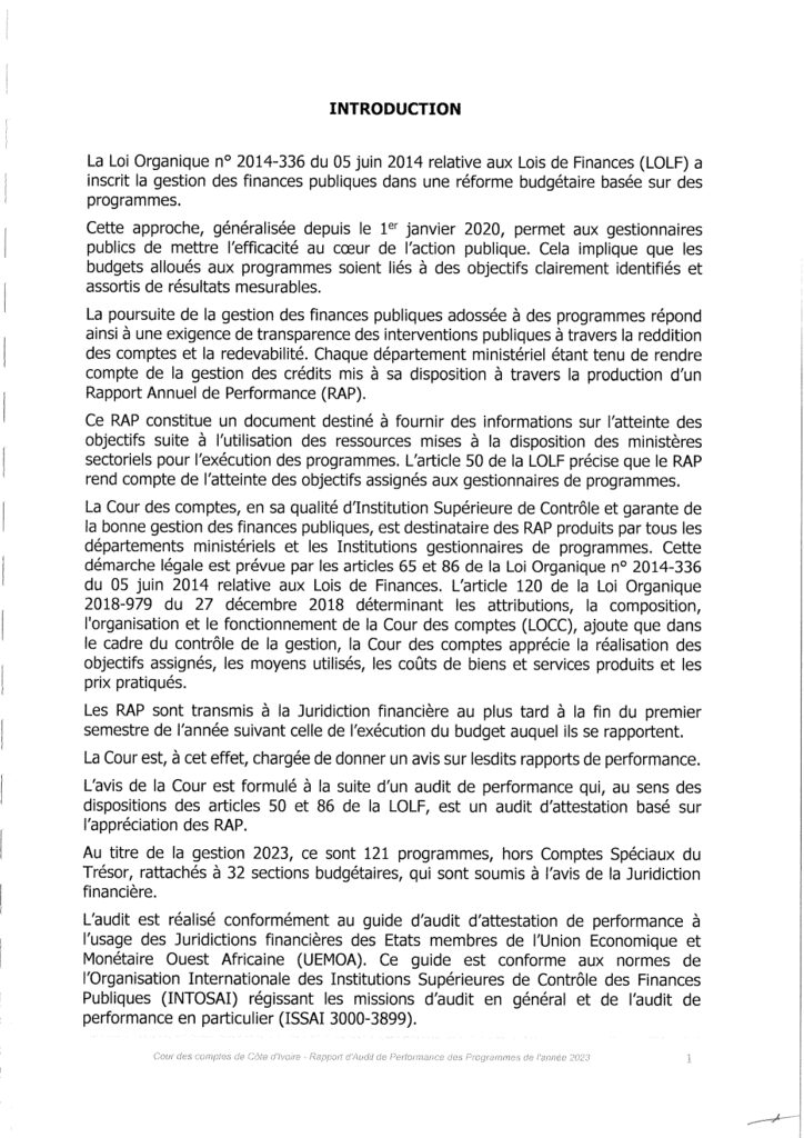 La Cour des comptes, Institution Supérieure de Contrôle garante de la bonne gestion des finances publiques, a procédé à l’audit de performance des programmes au titre de la gestion 2023. Ce rapport de la Cour des Comptes comprend quatre (04) chapitres qui mettent à nu, la gestion des ministères par les collaborateurs du chef de l’État Alassane Ouattara.