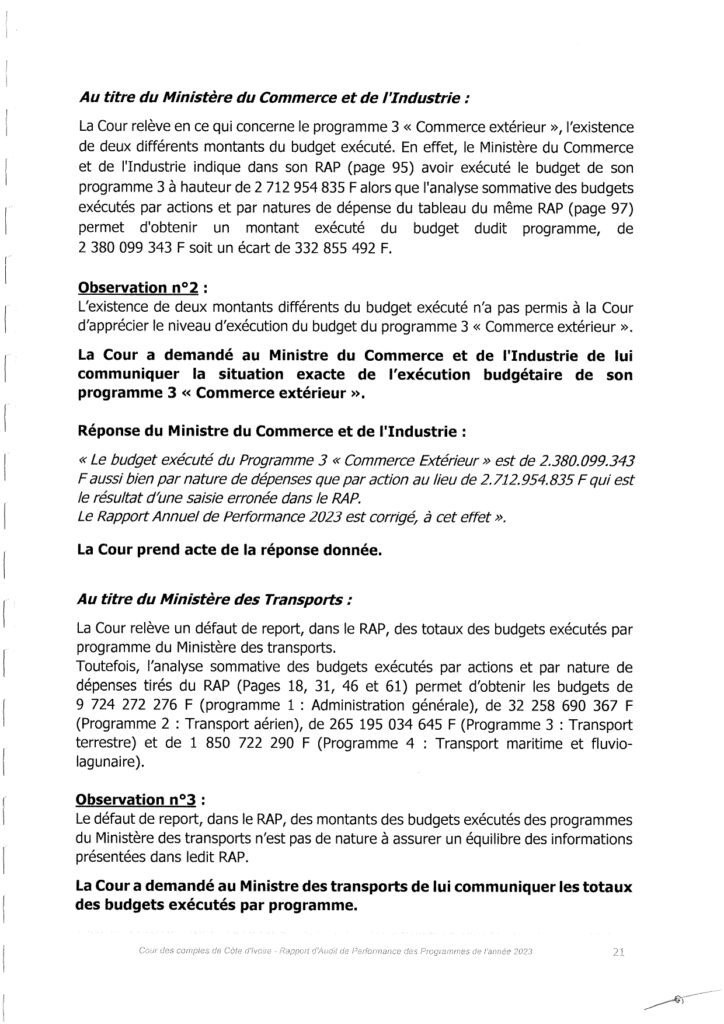« Les écarts observés s’expliquent par la différence des dates de prise en données budgétaires. Toutefois, suivant les recommandations précédentes de la Cour, des dispositions ont été prises et sont en cours de mises en œuvre au sein du Ministère des Finances et du Budget en vue de la résorption des discordances. II s’agit notamment de l’organisation d’un atelier en vue de l’adoption et la mise en œuvre dune procédure pour adresser cette problématique. Les résultats de ces mesures devraient commencer à être perceptibles à partir de l’exercice 2024 ».