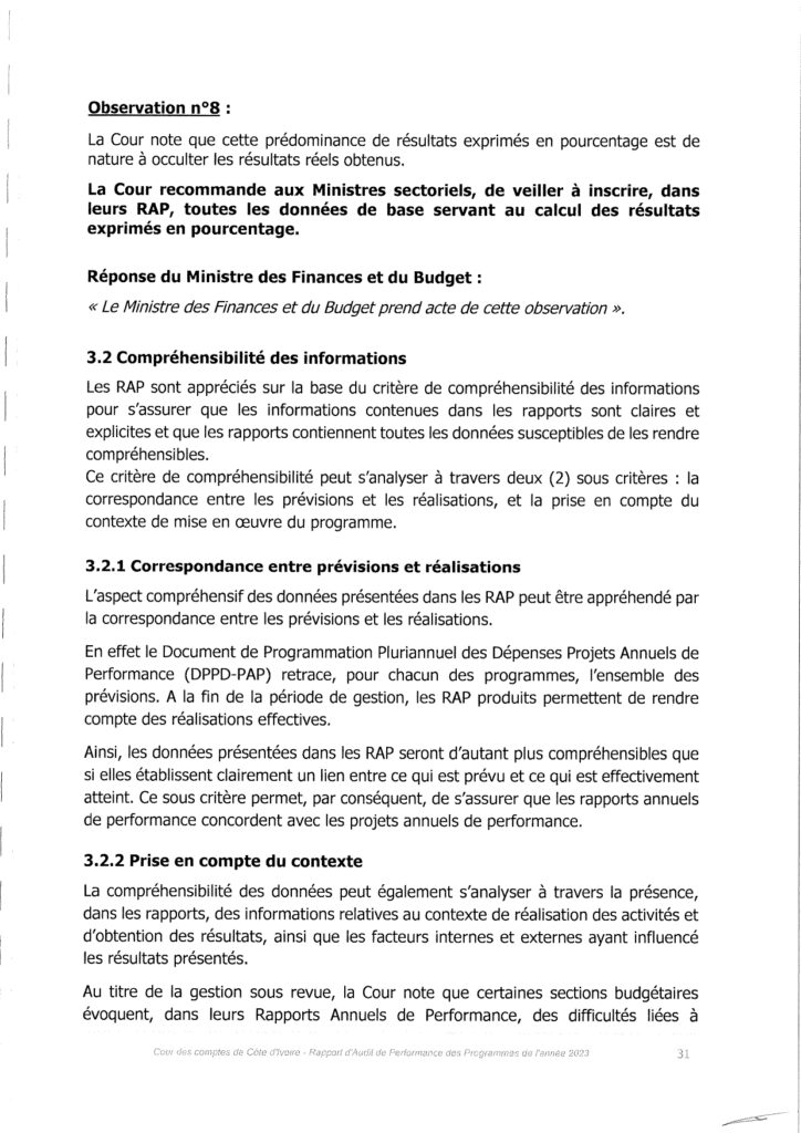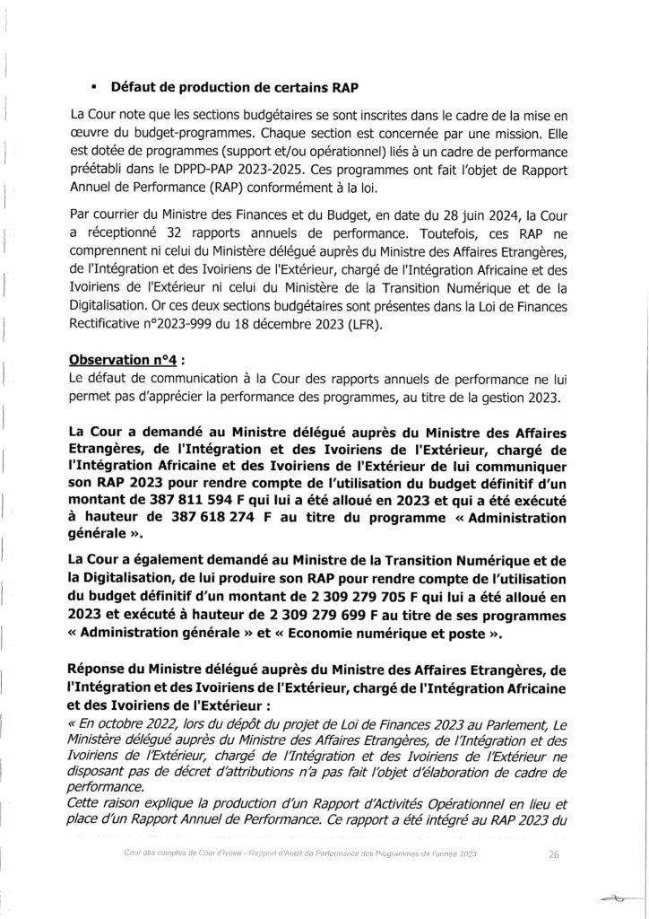 Par courrier du Ministre des Finances et du Budget, en date du 28 juin 2024, la Cour a réceptionné 32 rapports annuels de performance. Toutefois, ces RAP ne comprennent ni celui du Ministère délégué auprès du Ministre des Affaires Etrangères, de l’Intégration et des Ivoiriens de l’Extérieur, chargé de l’Intégration Africaine et des Ivoiriens de l’Extérieur ni celui du Ministère de la Transition Numérique et de la Digitalisation. Or ces deux sections budgétaires sont présentes dans la Loi de Finances Rectificative n°2023-999 du 18 décembre 2023 (LFR).