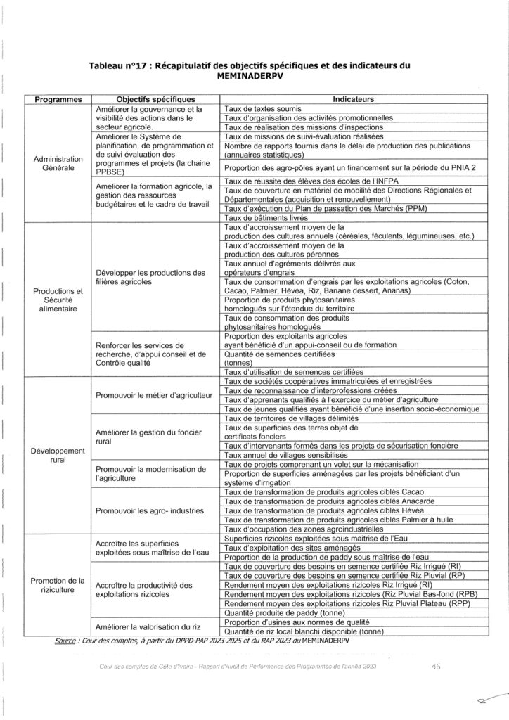 La Cour prend acte de la réponse donnée. Elle recommande au Ministre en charge de l’Agriculture de veiller à une reprise fidèle, dans son RAP, des indicateurs prévus dans le PAP.