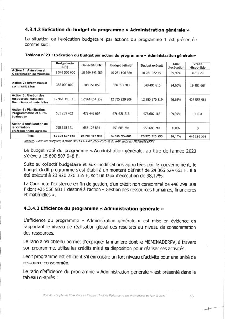 Toutefois, la Cour note, au titre du programme « Administration générale », l’existence d’un crédit de 44. 298.308 FCFA non consommé en fin de gestion dont 425.558.981 FCFA destiné à l’action « Gestion des ressources humaines, financières et matérielles » alors que le Ministère évoque une insuffisance de ressources financières nécessaires pour justifier la non atteinte de la cible de l’indicateur « Taux de réalisation des missions d’inspections ».