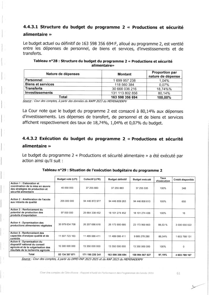 « Le montant exact de la situation d’exécution du Programme 3 « Développement rural» est de 68 546 180.317 FCFA. Le montant des biens et services dans des natures de dépenses est de 205.864.880 FCFA au lieu de 173.122.434 FCFA mentionné dans le document qui est le résultat d’une erreur de saisie. Le Rapport Annuel de Performance 2023 a été corrigé, à cet effet ».