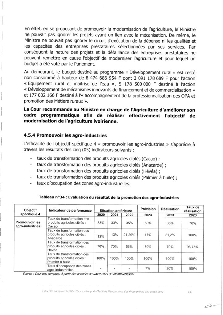 La Cour, tout en prenant acte des explications fournies, recommande au Ministre en charge de l’Agriculture de mettre en œuvre les diligences nécessaires en vue de produire les résultats attendus.