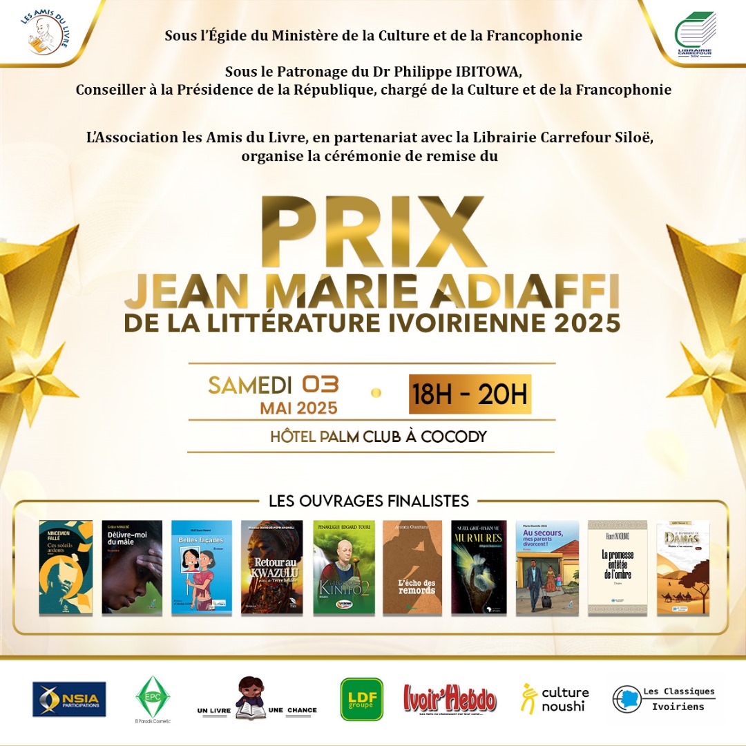 Le nom du lauréat du tout premier Prix Jean-Marie Adiaffi de la Littérature Ivoirienne sera dévoilé le 3 mai 2025, quelques jours avant l’ouverture du Salon International du Livre d’Abidjan, prévu le 6 mai. Ce prix, qui met à l’honneur la création littéraire ivoirienne, a vu 68 auteurs participer à cette première édition. Le lauréat sera révélé lors d’un dîner-gala qui se tiendra au Palm Club.