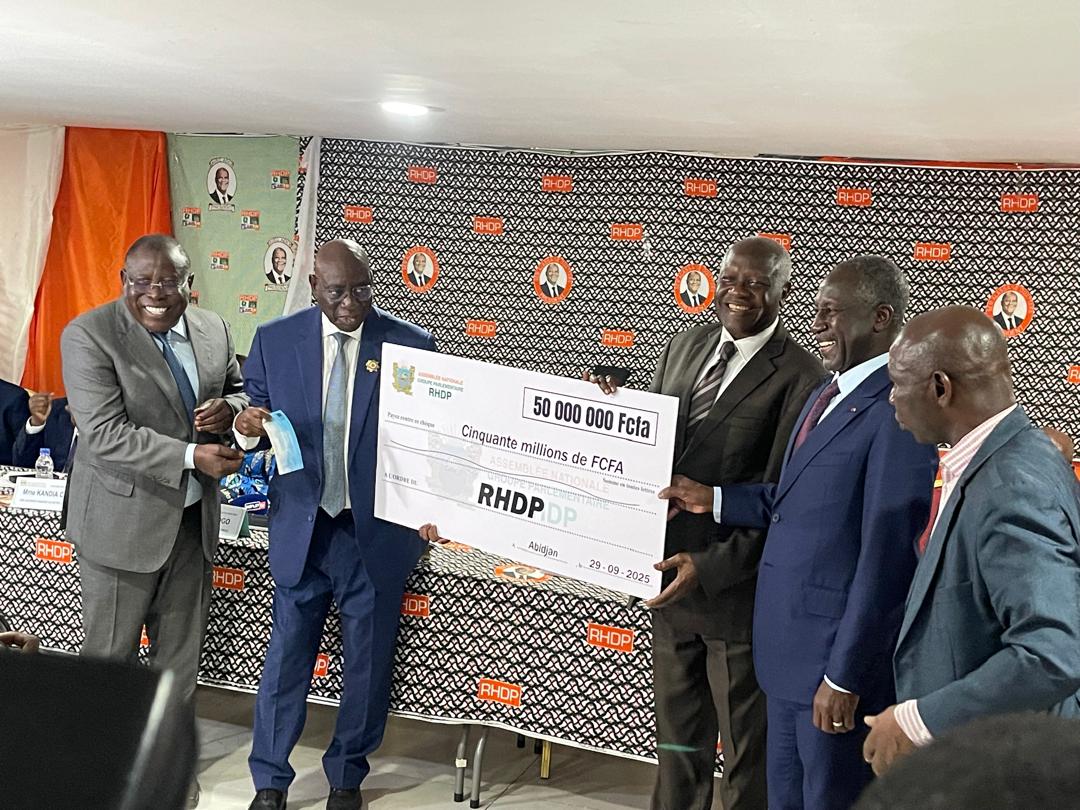 Les députés du groupe parlementaire du Rassemblement des Houphouétiste pour la Paix et la Démocratie ( RHDP) ont convié le lundi 29 septembre 2025, au siège dudit parti à la Rue Lepic de Cocody, leur directoire politique. Cette rencontre avait pour but de leur remettre des chèques au Directeur National de Campagne (DNC) du candidat Alassane Ouattara comme leur participation pour la campagne de l’élection présidentielle qui doit s’ouvrir le 10 octobre prochain.