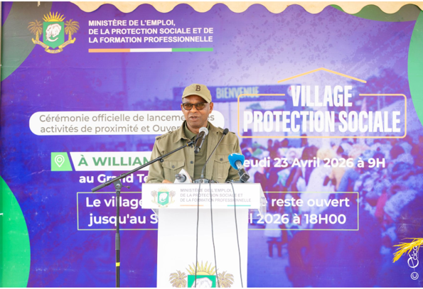 La cérémonie officielle de lancement des activités de proximité du ministère de l’Emploi, de la Protection sociale et de la Formation professionnelle, couplée à l’ouverture du village de la Protection sociale a eu lieu le 23 avril 2026 sur le grand terrain de Williamsville dans la commune d’Adjamé.